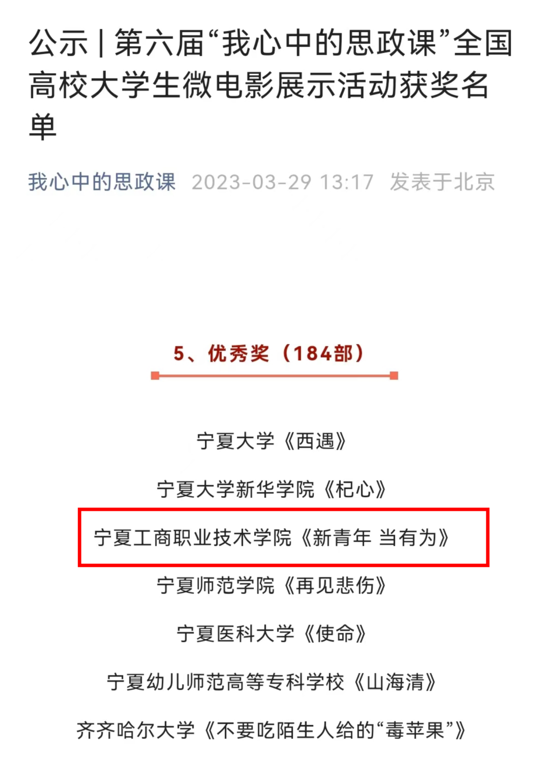 近日,由教育部高校思想政治理論課教學指導委員會主辦的第六屆“我心中的思政課”全國高校大學生微電影展示活動評選結果揭曉,寧夏工商職業技術學院馬克思主義學院微電影《新青年 當有為》榮獲優秀獎。