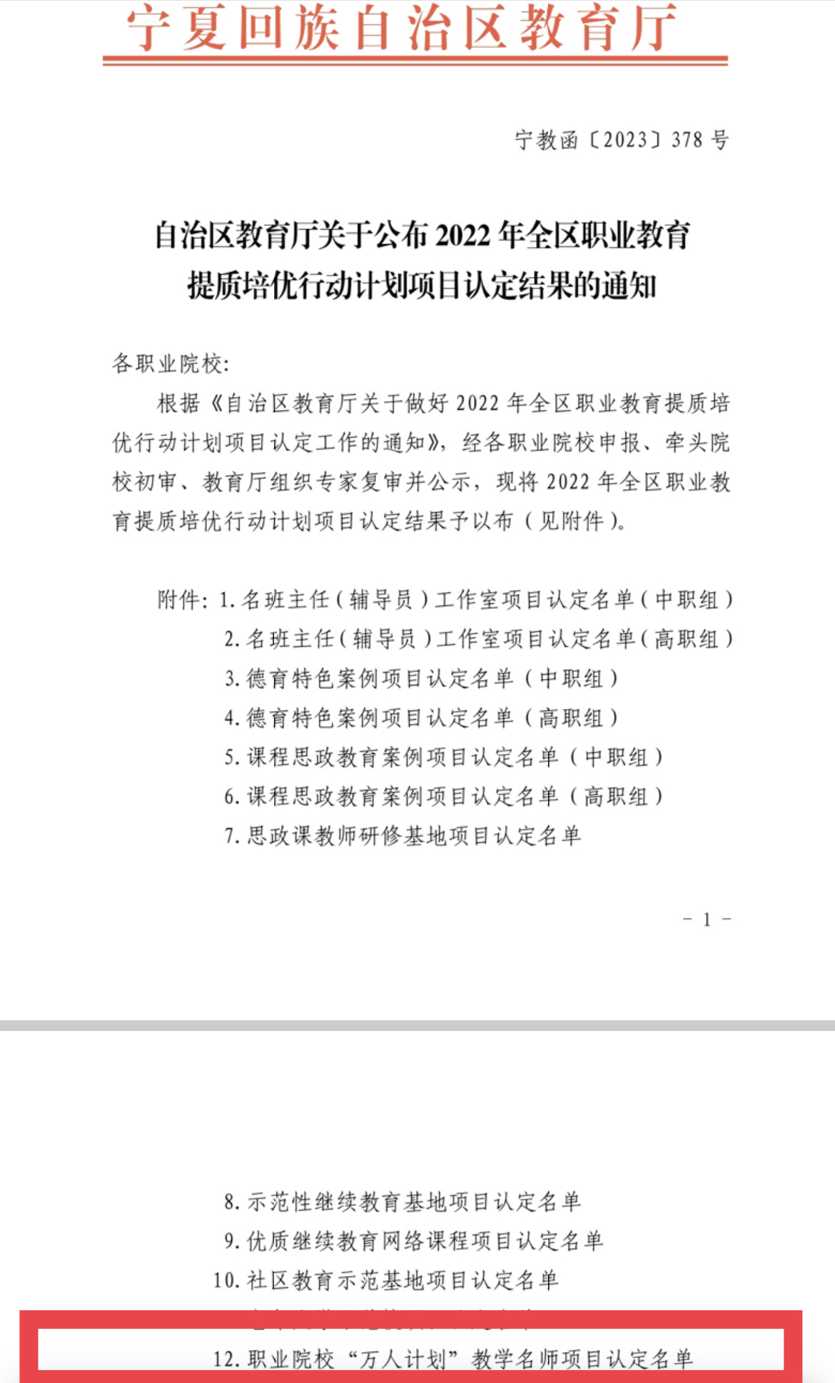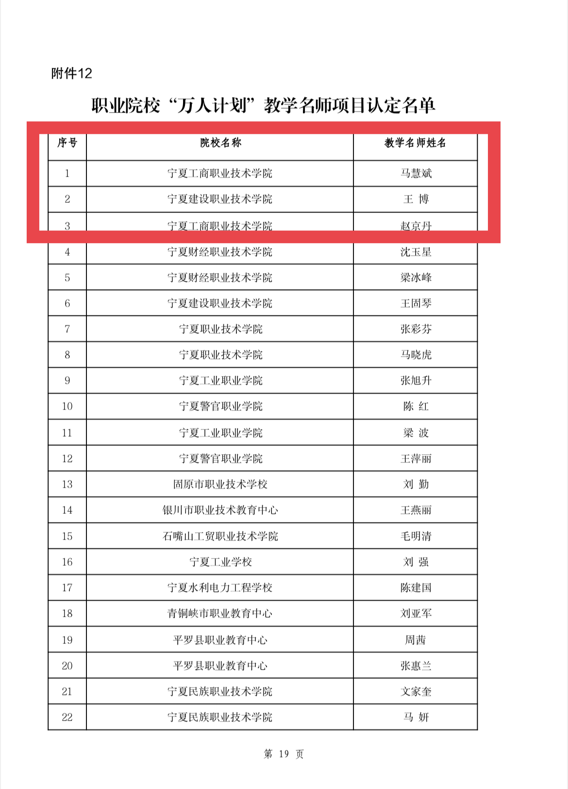 日前,自治區教育廳下發《關于公布2022年全區職業教育提質培優行動計劃項目認定結果的通知》,正式公布了2022年自治區職業院校“萬人計劃”教學名師入選人員名單。我校馬慧斌、趙京丹分別以全區排名第一,第三的優勢入選2022年自治區職業院校“萬人計劃”教學名師。