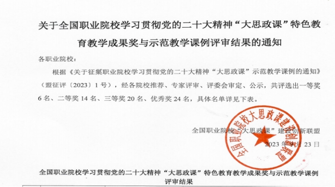 10月12日,在由全國職業院校“大思政課”建設創新聯盟主辦、多家全國高校思政課名師工作室承辦的全國職業院校學習貫徹黨的二十大精神“大思政課”特色教育教學成果獎與示范教學課例評選中,由馬克思主義學院鄧紅芳教學團隊申報的課堂革命典型案例獲得了二等獎,吳曉芹教學團隊和湯月娟教學團隊申報的教學成果和示范教學課例分別獲得了優秀獎。