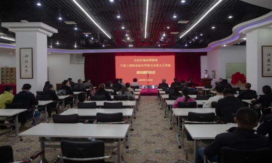 簽約儀式前,雙方共同觀看了宣傳片《十年光華璀璨地博》與《信仰鑄就馬院魂奮斗寫就馬院史》。隨后,自治區地質博物館黨委副書記、館長毛有明向與會人員介紹了地質博物館基本情況,他指出,自治區地質博物館是國家自然資源科普基地,收藏地質標本1.6萬多件,經過長期的探源溯流、精雕細琢,充分拓展“地質博物館+”模式,現已成功打造“流動的地質博物館”“博物館奇妙夜”等諸多科普品牌,成為寧夏靚麗的“地質名片”。同時,毛有明館長熱烈邀請寧夏工商職業技術學院攜手“登高望遠”,積極構建“思政+科普”教育新生態,通過寓教于樂的方式,拓展育人空間,共同在建設美麗新寧夏、共圓偉大中國夢的生動實踐中貢獻合力。