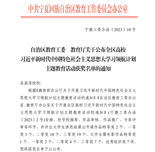 在剛剛公布的《自治區教育工委、教育廳關于公布全區高校習近平新時代中國特色社會主義思想大學習領航計劃主題教育活動獲獎名單的通知》中,我校馬克思主義學院教師指導學生參加第七屆全區高校大學生講思政課公開課和大學生微電影展示比賽獲得一等獎1項、二等獎和三等獎各2項。