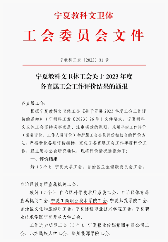近期,寧夏教科文衛(wèi)體工會(huì)通報(bào)了2023年度各直屬工會(huì)工作評(píng)價(jià)結(jié)果,寧夏工商職業(yè)技術(shù)學(xué)院工會(huì)獲得較好等次。這是寧夏工商職業(yè)技術(shù)學(xué)院工會(huì)連續(xù)第四年獲此佳績(jī)。