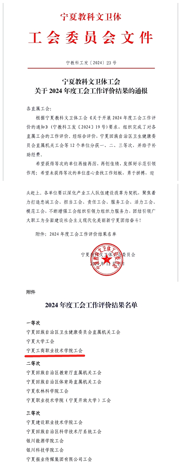 近日,寧夏工商職業(yè)技術學院在2024年教科文衛(wèi)體工會工作年度評價中榮獲第一等次。成績的取得不僅是學院工會全體同仁辛勤努力與不懈奮斗的結(jié)晶,更是學院整體實力與良好形象在工會工作領域的生動彰顯。