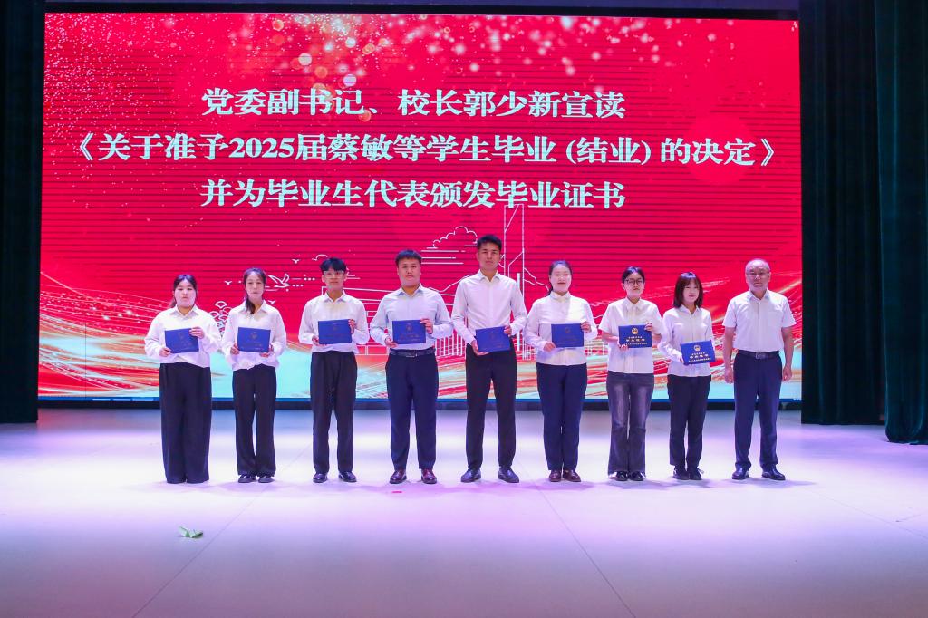上午十時,莊嚴的國歌拉開了典禮的序幕。校長郭少新宣讀了《關于準予2025屆蔡敏等學生畢業 (結業) 的決定》,并為畢業生代表頒發了畢業證書。黨委副書記寧曉娟宣讀了《關于表彰2025屆優秀畢業生的決定》,并為優秀畢業生頒發榮譽證書及紀念品。畢業生代表旅游管理學院李穩亮同學,回顧了自己在校三年追尋夢想的求學故事,號召同學們胸懷鴻鵠之志,肩負時代重任,努力成為有理想、敢擔當、能吃苦、肯奮斗的高端技能人才。教師代表能源化工學院羅靈芝教授,向全體畢業生表達了真摯祝賀與深情囑托。