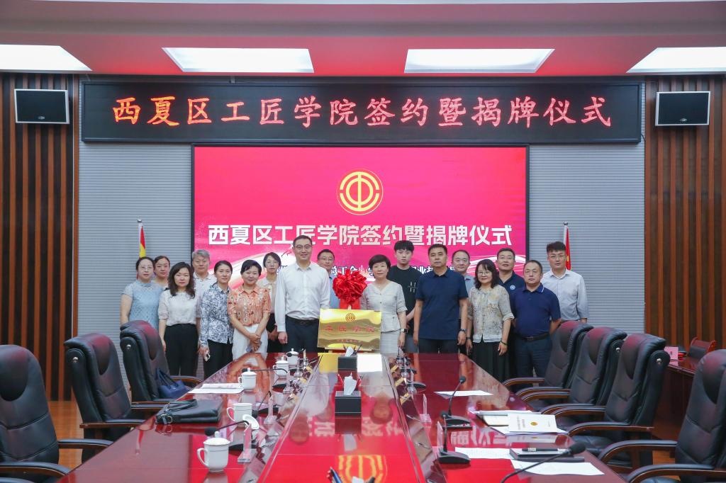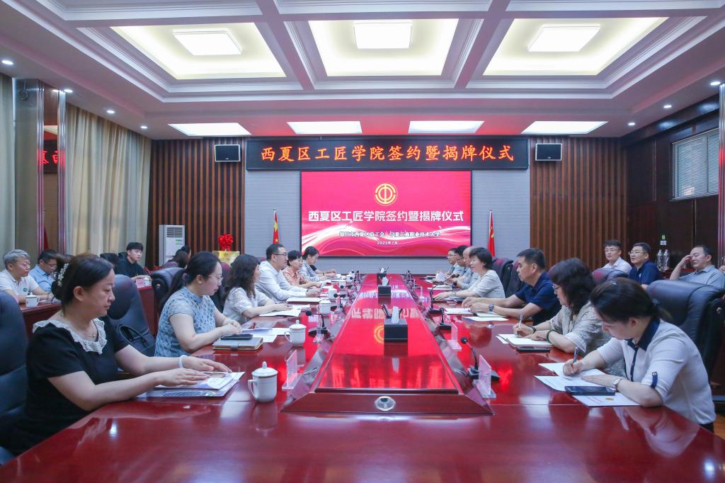 7月1日上午,銀川市西夏區工匠學院簽約暨揭牌儀式在寧夏工商職業技術大學舉行。西夏區、寧夏工商職業技術大學相關領導及企業代表出席活動,簽約儀式由學校黨委副書記寧曉娟主持。