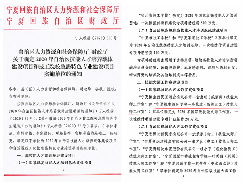 近日,寧夏人力資源和社會保障廳發布了“關于確定2020年自治區技能人才培養載體建設項目和技工院校急需特色專業建設項目實施單位的通知”(寧人社函〔2020〕350號),寧夏工商職業技術學院機械工程學院馬慧斌領銜建設的“數控加工技能大師工作室”,經過資料審核、專家提問、現場答辯和實地考察等層層選拔,最終獲批國家級技能大師工作室。