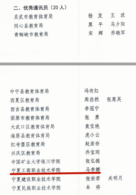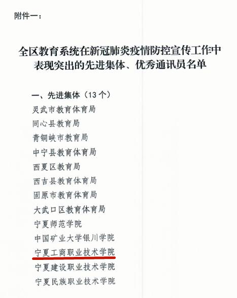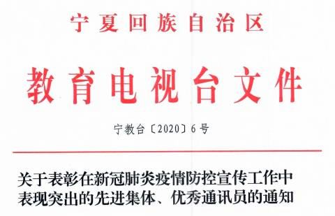 近日,寧夏教育電視臺印發了《關于表彰在新冠肺炎疫情防控宣傳工作中表現突出的先進集體、優秀通訊員的通知》寧教臺[2020]6號,寧夏工商職業技術學院被評為先進集體,馬李娜被評為優秀通訊員。
