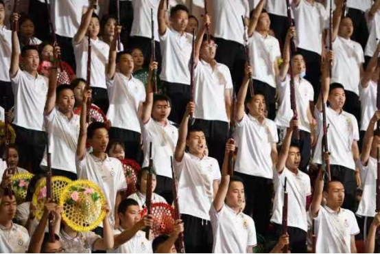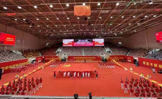 匯演分為《黨旗映山河光輝暖心間》、《凝心共奮斗砥礪再揚帆》、《同心跟黨走奮進新征程》三個篇章,我校在第一篇章率先出場,500余名團員青年高唱長征組歌中曲目之一《四渡赤水出奇兵》,團員青年精神飽滿、節奏統一、飽含激情,演出開場擺出了“青春向黨”的字樣,高亢嘹亮的歌聲感染了在場所有人,博得全場陣陣掌聲。