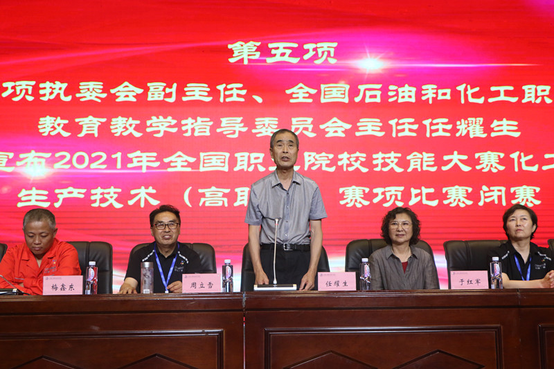 閉幕式最后,由賽項執委會副主任、全國石油和化工職業教育教學指導委員會主任任耀生宣布2021年全國職業院校技能大賽化工生產技術(高職組)賽項閉賽。