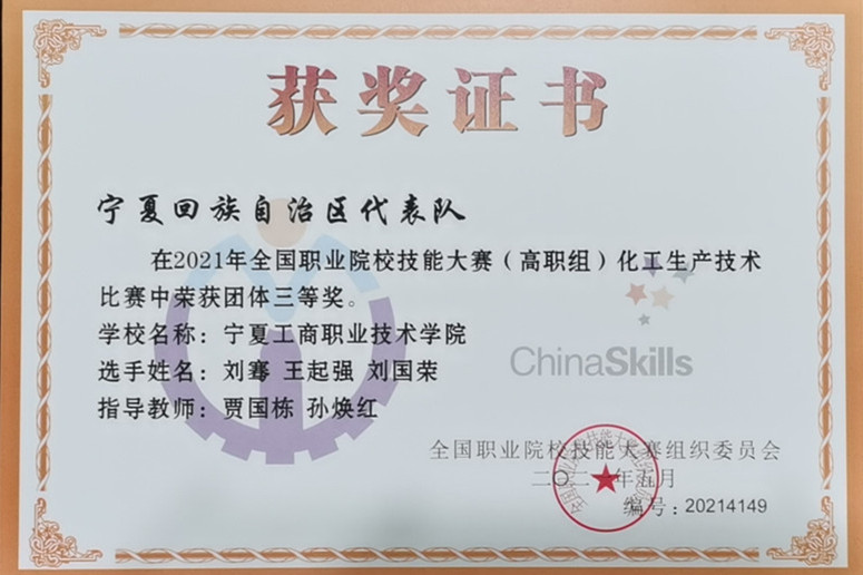6月30日,2021年全國職業(yè)院校技能大賽化工生產(chǎn)技術(shù)高職組賽項在寧夏工商職業(yè)技術(shù)學(xué)院圓滿落幕。本次大賽中,我校能源化工學(xué)院老師賈國棟、孫煥紅指導(dǎo)的學(xué)生王起強、劉騫、劉國榮,代表學(xué)校和寧夏回族自治區(qū)參加比賽。最終,在與來自全國26個省、市、區(qū)共計26支代表隊的激烈角逐中脫穎而出,以優(yōu)異的成績榮獲2021年全國職業(yè)院校技能大賽(高職組)化工生產(chǎn)技術(shù)賽項團體三等獎。