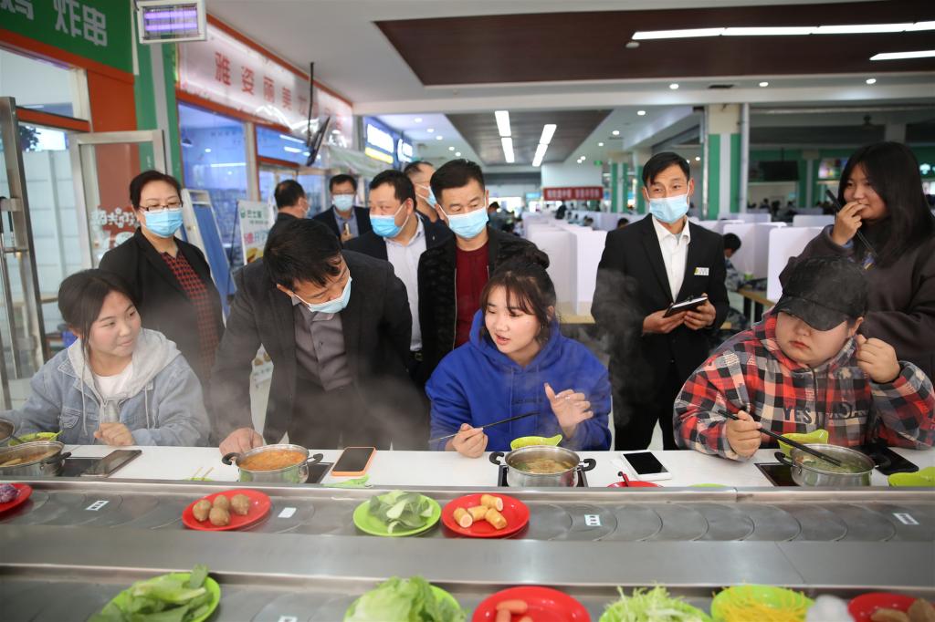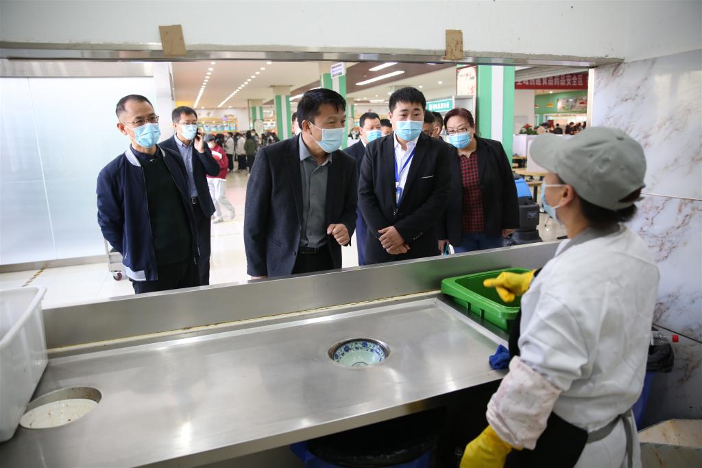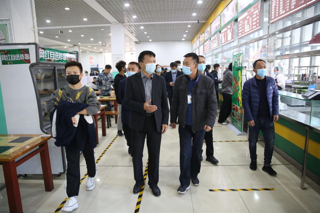 在學生餐廳,校領導查看了餐廳日常清潔、通風、消毒等情況,要求餐廳管理人員要加強食品安全重點環節的監督管理,特別是在食品原材料采購、食品生產加工操作、餐具洗消保潔及從業人員疫情防控知識培訓等方面要切實將工作做細做實。