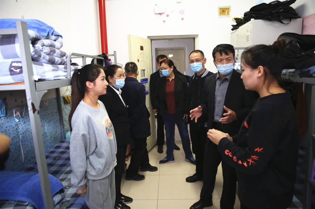 在學生宿舍,校領導與正在準備就餐的學生進行了交流,叮囑同學們嚴格遵守疫情防控期間學校的各項管理規定,做好個人防護,保持良好宿舍衛生,在生活和學習上遇到困難時可以告知學校老師,學校會盡最大努力提供幫助,提醒同學們在疫情防控期間養成良好的生活習慣和積極的心理狀態。