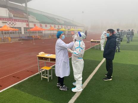 圖四 為參與大規(guī)模人群核酸采樣的志愿者整理防護服
