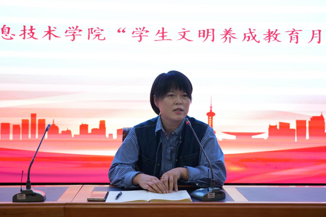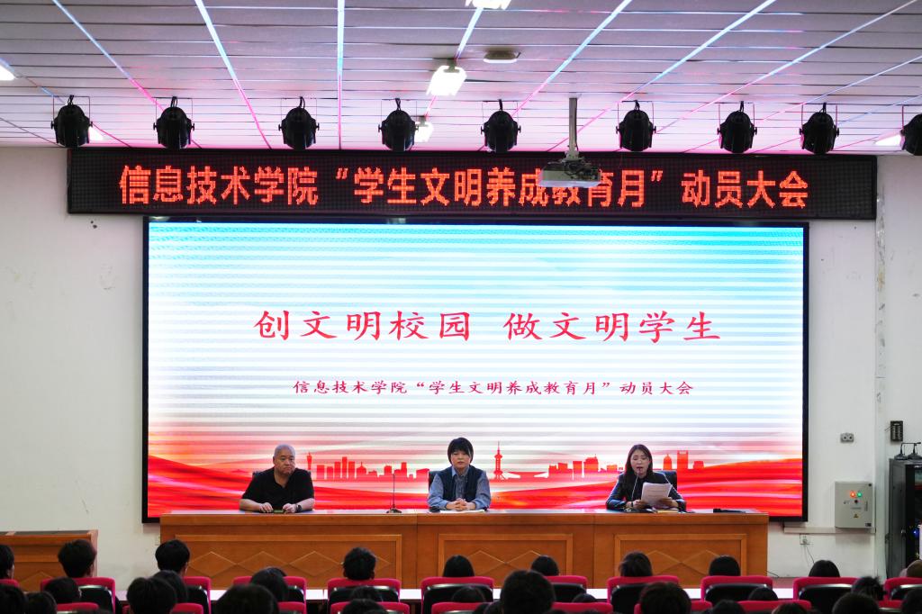 為進一步引導學生養成良好的行為習慣,提升同學們的綜合素質,促進良好校風、學風建設,營造一個文明健康、積極向上的學習生活環境。9月25日下午,信息技術學院在清風園一樓報告廳召開“學生文明養成教育月”宣傳動員大會,學院黨總支書記吳金霞、黨總支專職副書記任海濤、全體學工人員、全體學生參加了此次會議,會議由袁穎主持。
