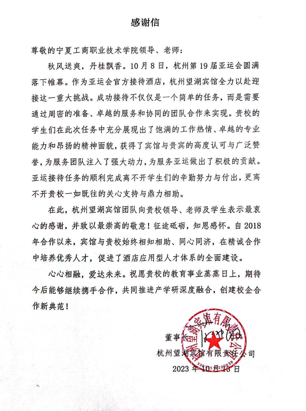鑒于師生志愿者在本次活動中表現(xiàn)出精湛的技術(shù)和良好的組織能力,10月13日,杭州望湖賓館發(fā)來感謝信,對參與本次活動的旅游管理學院的師生表示感謝,同時對學院大力支持企業(yè)活動表示由衷的敬意。