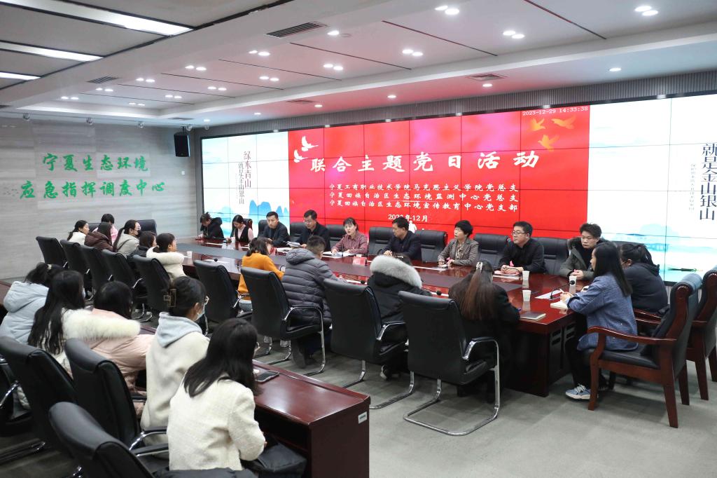 自治區(qū)生態(tài)環(huán)境宣傳教育中心黨支部書記、主任牛進頻,自治區(qū)生態(tài)環(huán)境監(jiān)測中心黨總支書記葉自彩、寧夏工商職業(yè)技術(shù)學院馬克思主義學院黨總支書記陳娜,以及三家單位黨員代表參與了本次活動。