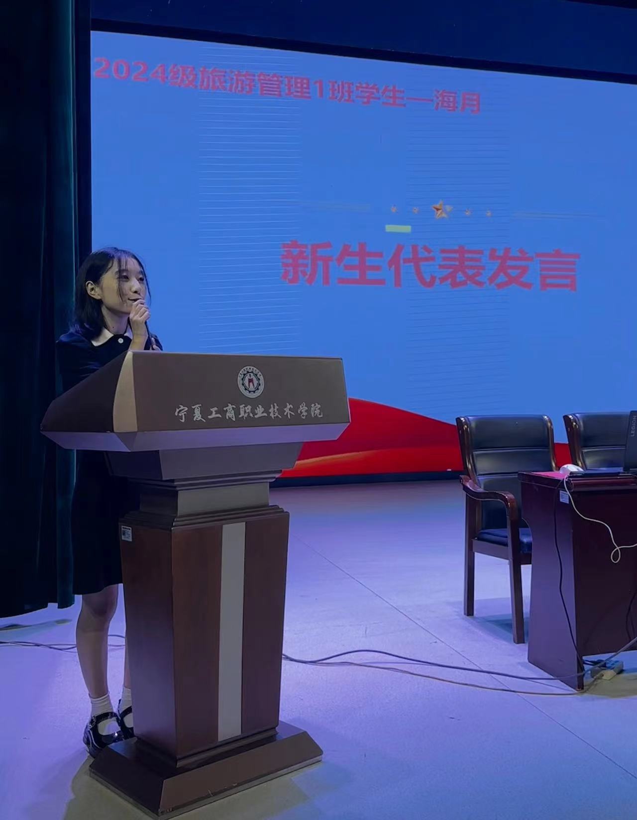 新生代表2024級旅游管理專業海月發言。她感恩學校為新生所創造的良好的學習生活環境,并與全體新生共勉:積極投身社會實踐,充分鍛煉自己的社交、協調與抗壓能力;有規劃有目標,做自己生活的掌舵人;認真學好每一門課程,掌握扎實的理論基礎和專業技能。