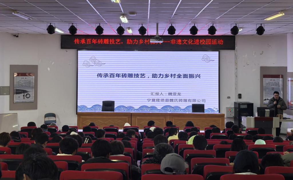 本次講座邀請到了國家級非物質文化遺產磚雕項目——固原磚雕——自治區級非遺代表性傳承人魏亞龍先生,魏先生深入淺出地講解了固原磚雕的百年傳承歷史,從起源、發展脈絡,到獨特的技藝手法,如雕刻工具的運用、圖案設計的內涵等,并分享了磚雕技藝在助力鄉村振興中的積極作用,讓學生們深刻感受到傳統技藝與現代社會發展的緊密聯系。講座現場氣氛熱烈,學生們積極提問互動,對磚雕技藝表現出濃厚興趣。