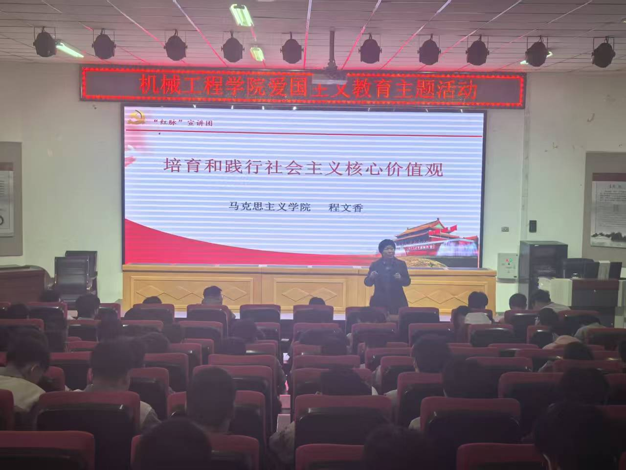 為踐行社會主義核心價值觀,機械工程學院于4月21日開展了愛國主義教育專題講座。本次講座邀請馬克思主義學院程文香院長主講,學院學工人員、學生代表等300余人參加了此次活動。