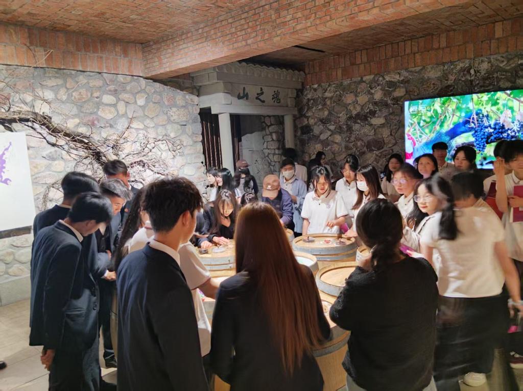 隨后,師生一行赴賀蘭山東麓志輝源石酒莊和藍賽酒莊開展實地研學。通過參觀釀酒車間、葡萄園基地及酒文化展廳,學生直觀了解葡萄種植、釀造工藝及品牌營銷全流程,并與酒莊技術人員交流互動,深化對葡萄酒文旅融合、品質管理等實踐課題的認知。