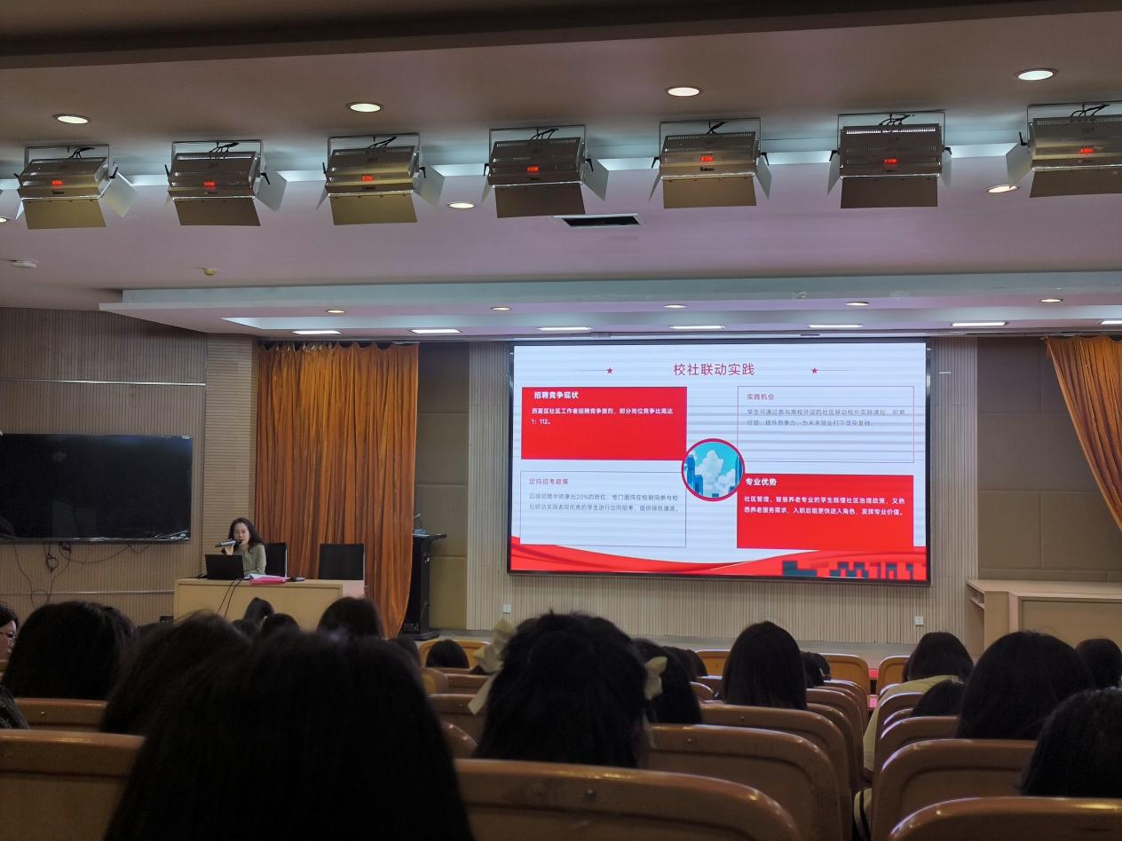 馬嘉妮部長以“校地攜手共筑基層治理新未來”為題,圍繞行業趨勢、人才需求、職業成長與核心競爭力展開講解。她指出,社區職能已向多元領域拓展,需培育 “社區工程師” 式人才;介紹了西夏區“高校助力基層治理實驗室”等校地合作項目,以及社區工作者的晉升通道與補貼政策,強調 “專業 + 實踐 + 證書” 的職業發展路徑。