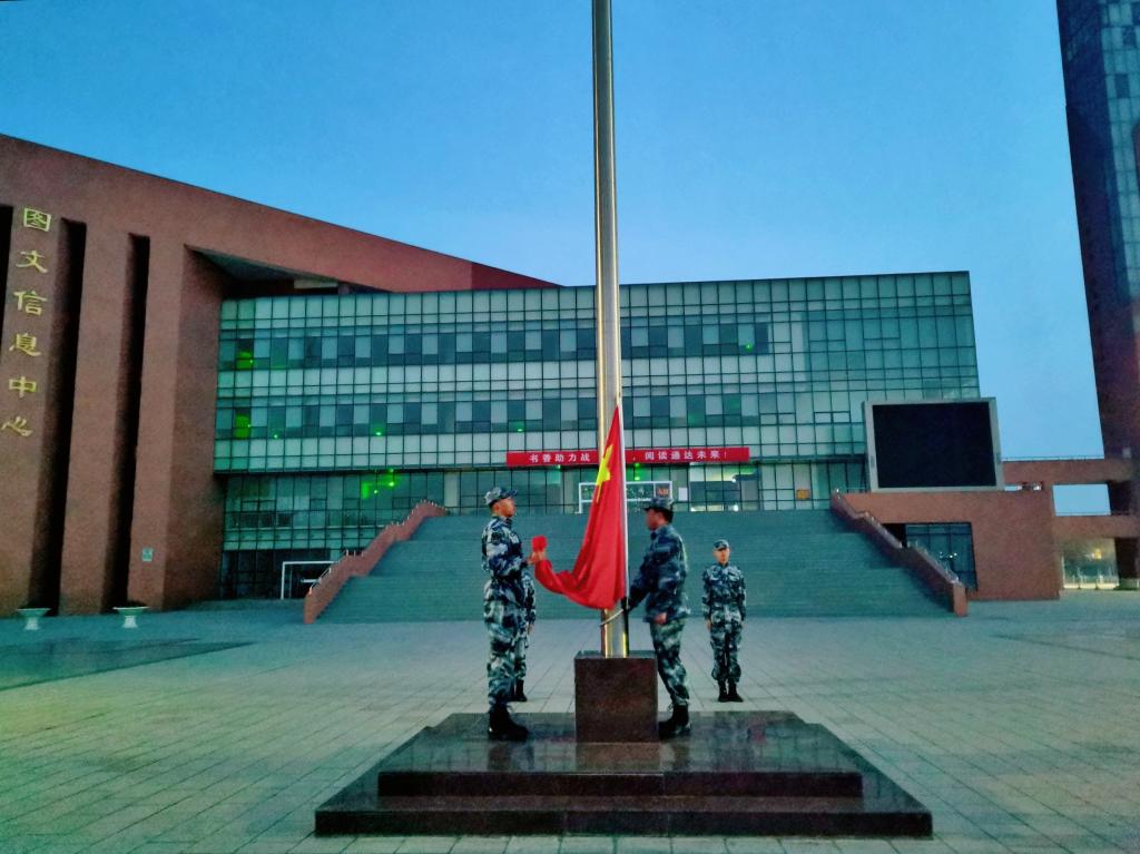 7時20分,英姿颯爽的國旗護衛隊護送五星紅旗進場,他們身姿挺拔,步伐整齊,隨著一聲“立定”,護衛隊隊員以軍姿站定。隨后,伴隨著莊嚴的《義勇軍進行曲》,五星紅旗在圖文信息廣場冉冉升起,全體師生滿懷著對祖國的崇高敬意和熱愛之情向國旗行注目禮。