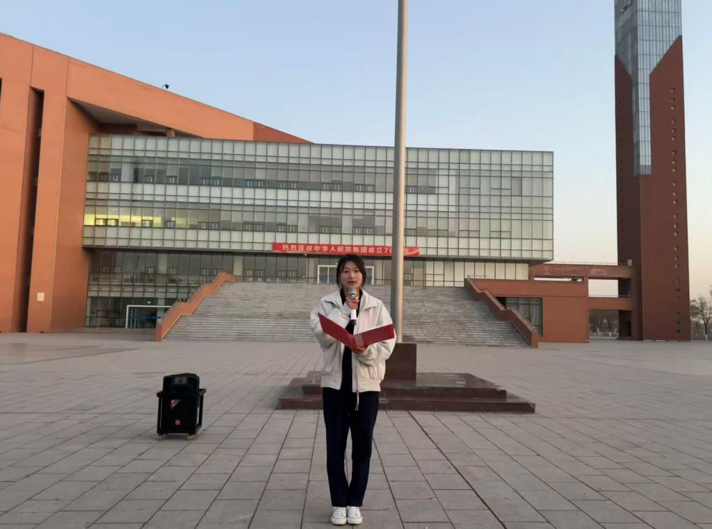 2025級旅游管理1班學生楊晶做《以青春之我,筑團結之基,赴時代之約》國旗下的演講。她呼吁全體學生要倍加珍惜和諧幸福的新時代,共同奮斗,在學習、生活上像石榴籽一樣緊緊團結在一起,堅定不移跟黨走,做民族團結的堅定擁護者、有力宣傳者和忠實踐行者。