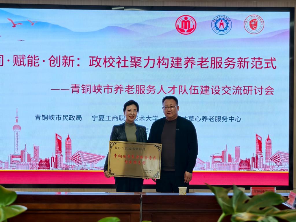 在交流座談會上,人文教育學院院長董麗華介紹了學院智慧健康養老服務與管理專業建設、校企合作及人才培養成果,學校職業技能鑒定所副所長方正劍對養老服務行業相關職業技能鑒定的政策要求作了詳細解讀。與會雙方圍繞“深化產教融合 共育養老人才”的主題進行了熱烈的研討交流。最后,青銅峽市民政局養老科主任張彥青代表青銅峽市民政局宣讀了《關于聘請寧夏工商職業技術大學人文教育學院公共管理教研室為青銅峽市養老服務專家智庫指導團的決定》,并現場授牌,為“政、校、社”三方深入合作拉開了序幕。