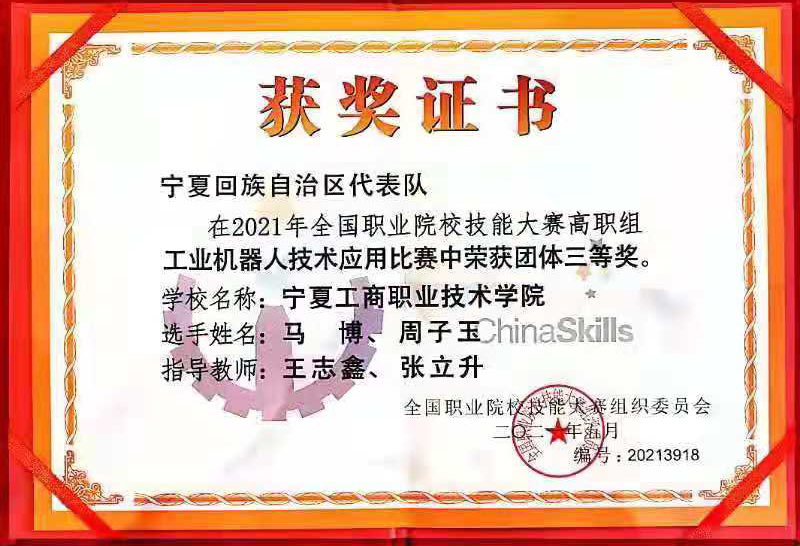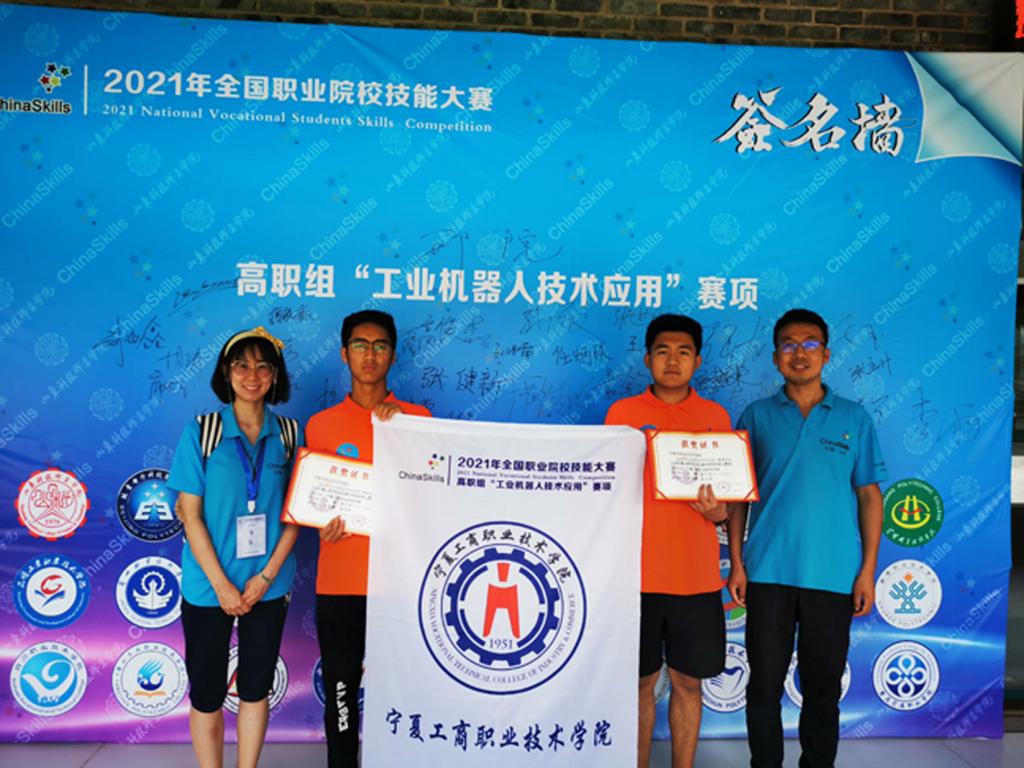 2021年全國職業院校技能大賽(高職組)工業機器人技術應用賽項中,電控學院王志鑫和張立升兩位老師指導的學生馬博和周子玉代表學校和寧夏回族自治區參賽,一路披荊斬棘,最終以優異成績奪得三等獎。