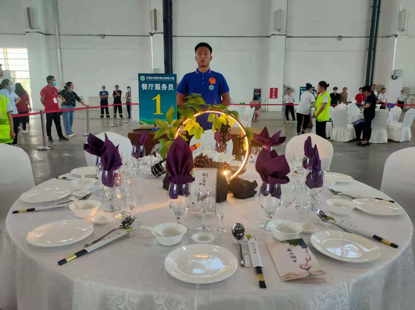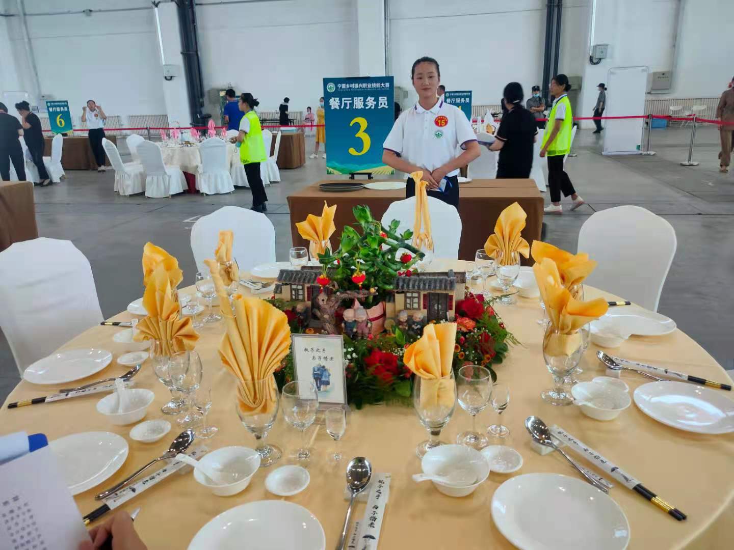 本次大賽共設有砌筑工、育嬰員、養老護理員、餐飲服務員、美發師、西式面點師、汽車維修工、農機修理工等8個比賽項目,我校學生代表銀川代表隊參加餐廳服務員項目。經過緊張備賽,旅游管理學院2020級酒店管理學生幕展望獲全區餐廳服務一等獎并獲得自治區級“技術能手”稱號;其他四名參賽學生2020級酒店管理陳富女、張智榮、喬興樂、董歡均進入前12名,獲優秀獎,王彬華老師獲優秀指導教師,李紅娟老師獲優秀裁判員,袁靜老師獲優秀工作者,寧夏工商職業技術學院獲得特殊貢獻獎。