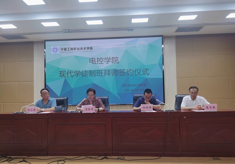 2021年9月14日下午,電控學院機電一體化、電氣自動化技術專業“現代學徒制”試點專業拜師簽約儀式在圖書館報告廳隆重舉行。副校長原秦英、電控學院院長施衛保、副院長李輝、杜戈、專業教研室主任及寧夏隆基光伏科技有限公司技術總監徐鵬國、外聯經理樊凱、人力資源經理宋麗娟,寧夏小牛自動化設備有限公司副總經理潘玉寶、綜合部主任劉榮出席了大會。