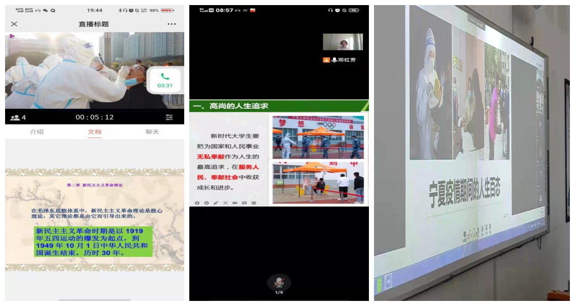 多措并舉,確保線上教學(xué)效果。馬克思主義學(xué)院承擔(dān)著全校思政課教學(xué)任務(wù),《思想道德與法治》、《毛澤東思想和中國特色社會主義理論體系概論》均為合班課,合班人數(shù)多達100多人,最小的合班課也在70多人以上。如何開展好線上教學(xué),保證教學(xué)效果,保證教室里的學(xué)生不流失?馬克思主義學(xué)院多措并舉,采取線上線下齊抓共管。線下,由分管教學(xué)工作的馬克思主義學(xué)院副院長張威,穿梭在所有思政課教室,幫助學(xué)生解決設(shè)備鏈接、直播答疑等問題,監(jiān)督檢查坐在教室里的學(xué)生聽課、學(xué)習(xí)、與線上老師互動等情況,并第一時間將現(xiàn)場存在的問題反饋給授課教師,及時解決線上教學(xué)的弊端問題。學(xué)校二級督導(dǎo)隊伍,對線上教學(xué)實施全面監(jiān)控,確保思政課始終守好意識形態(tài)責(zé)任田。線上,為進一步提升線上教學(xué)質(zhì)量,全體思政課教師充分調(diào)動學(xué)生積極性,進行有效地線上互動。思政課教師們,一邊運用騰訊會議監(jiān)控著教室里的學(xué)生學(xué)習(xí)狀況,一邊運用超星直播上課,再運用手機學(xué)習(xí)通與學(xué)生互動。在寧夏這場突如其來的疫情面前,我們每一位思政課教師都是勇敢的戰(zhàn)士,彰顯了強烈的責(zé)任擔(dān)當(dāng)。