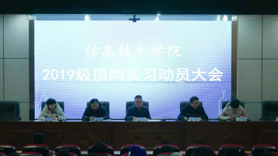 為做好2019級(jí)學(xué)生頂崗實(shí)習(xí)工作,教育引導(dǎo)學(xué)生做好頂崗實(shí)習(xí)前的相關(guān)準(zhǔn)備工作。11月15日,信息技術(shù)學(xué)院在清風(fēng)園召開了2019級(jí)頂崗實(shí)習(xí)動(dòng)員大會(huì)。陳志懷副校長(zhǎng)、招生就業(yè)處副處長(zhǎng)顧福海、信息技術(shù)學(xué)院院長(zhǎng)閆寧、副院長(zhǎng)馬玉華、趙京丹、學(xué)工辦主任袁穎及2019級(jí)全體學(xué)生參加了此次會(huì)議。受疫情影響,本次頂崗實(shí)習(xí)動(dòng)員大會(huì)分四個(gè)場(chǎng)次進(jìn)行。
