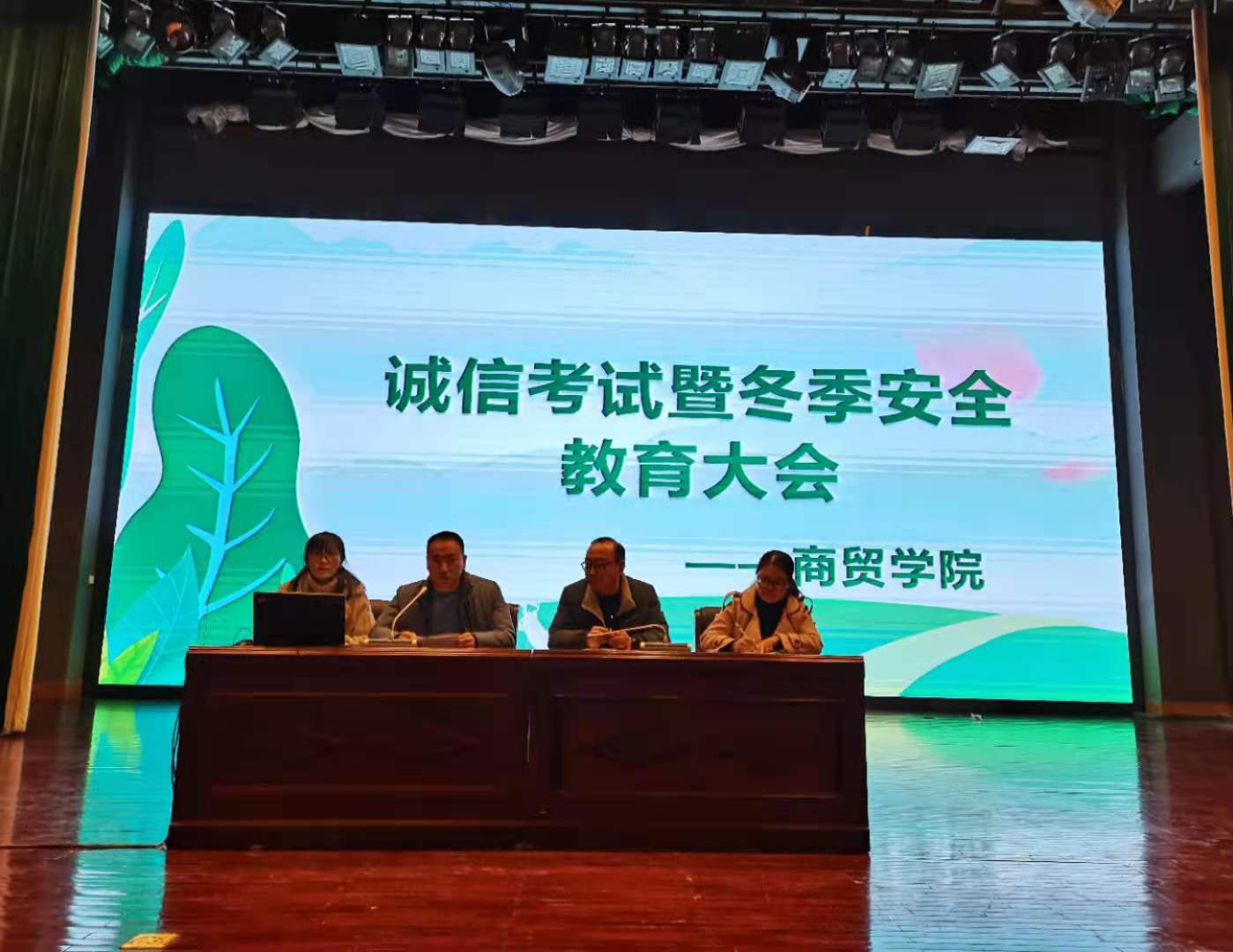 為進(jìn)一步提升學(xué)生安全意識(shí),樹立誠信考試觀念,12月22日晚,商貿(mào)學(xué)院在大學(xué)生活動(dòng)中心召開誠信考試暨冬季安全教育大會(huì)。商貿(mào)學(xué)院黨總支書記、黨總支副書記、學(xué)辦主任、專兼職輔導(dǎo)員及全體學(xué)生參加會(huì)議。