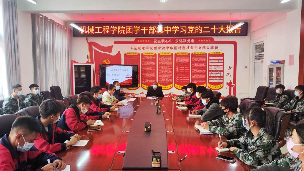 10月19日,機械工程學院團總支組織團學干部集中學習了《中國共產黨第二十次全國代表大會報告》。各班級團支部書記參加了會議,學院黨總支書記龐鴻斌、黨總支專職副書記買學斌出席,會議由團總支書記王強主持。
