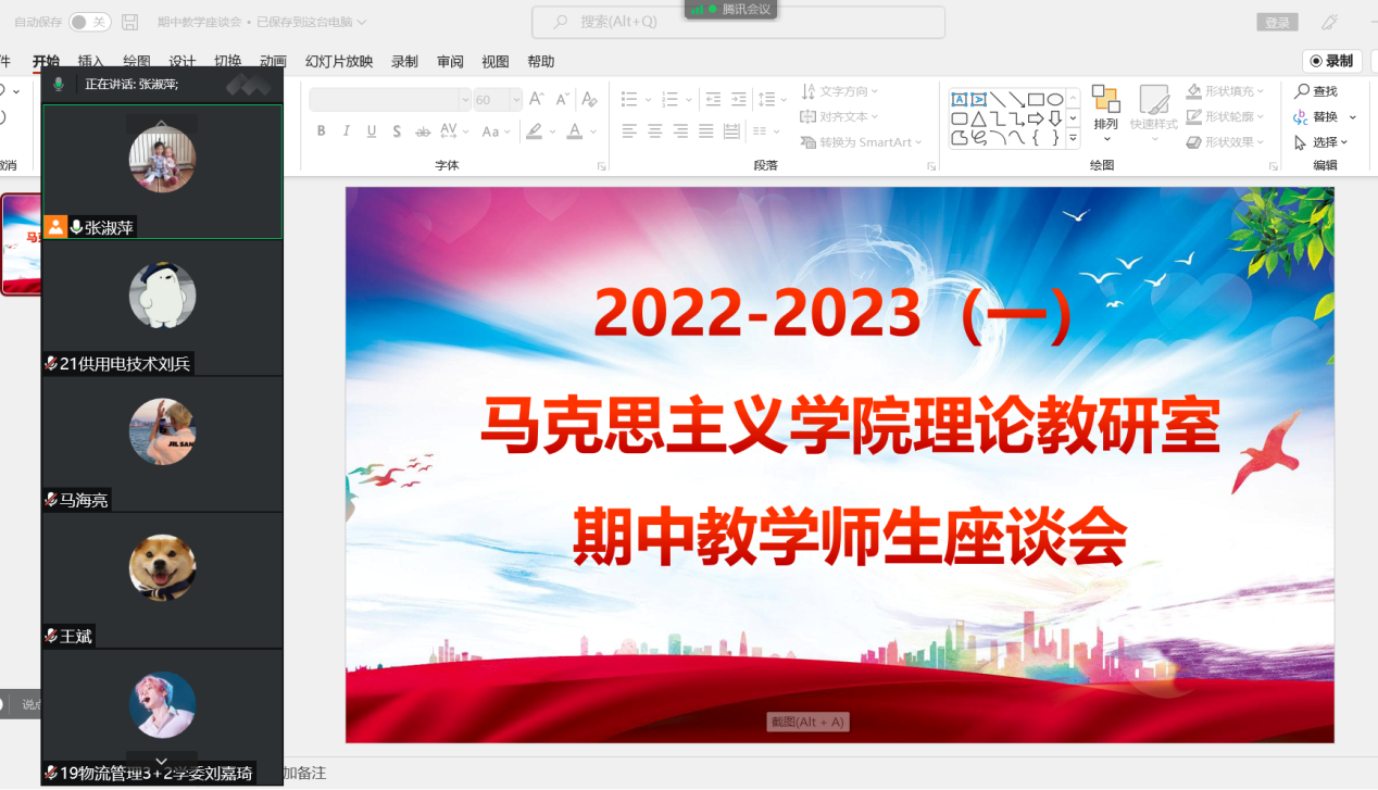 為全面了解和掌握學院線上教學整體運行情況,及時發現和解決教學過程中存在的問題,進一步提升線上教學質量和加強學生學風建設,馬克思主義學院理論教研室于11月3日中午在線上召開了2022--2023學年第一學期期中教學師生座談會。學院院長趙志梅、副院長張威、教研室部分教師及2021級各班學生代表參加了座談會。座談會由理論教研室主任張淑萍主持。