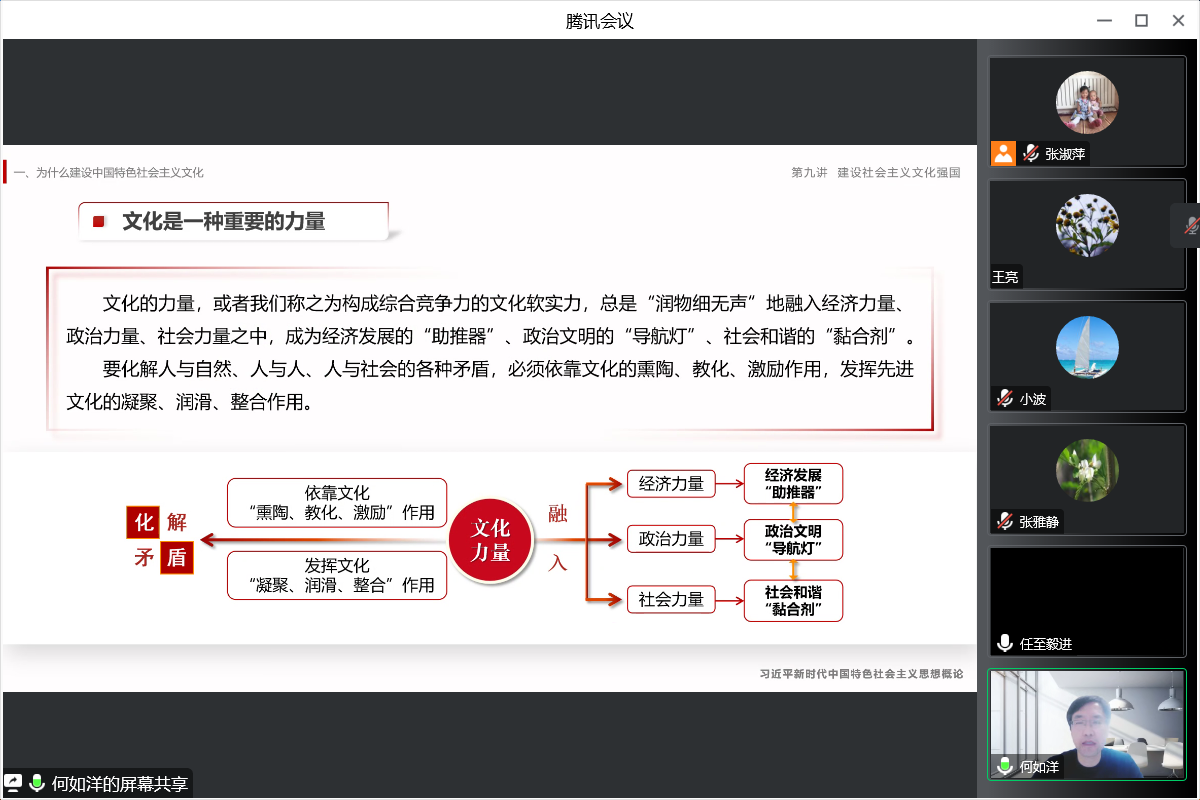 面對(duì)突如其來(lái)的疫情,思政課教學(xué)從線下搬到云端。教學(xué)方式雖變,但思政課用真理、真情引導(dǎo)學(xué)生思想和信仰的作用不能變。11月2日下午,為進(jìn)一步改進(jìn)線上思政課教學(xué),疏解學(xué)生心理和思想問(wèn)題,集中研討教學(xué)內(nèi)容和方式優(yōu)化,增強(qiáng)思政課在線育人的針對(duì)性和實(shí)效性。馬克思主義學(xué)院理論教研室教師齊聚云端,召開(kāi)了本學(xué)期第4期的云端集體備課會(huì)。這次備課會(huì)圍繞專題《建設(shè)社會(huì)主義文化強(qiáng)國(guó)》展開(kāi)深入研討和經(jīng)驗(yàn)交流。