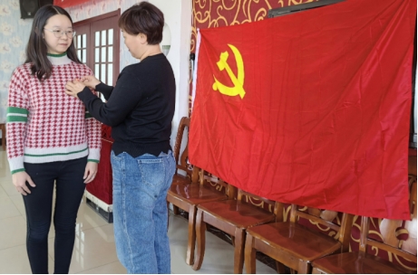面對黨旗,黨支部書記為預備黨員佩戴黨員徽章、贈送黨章及紅色書籍。