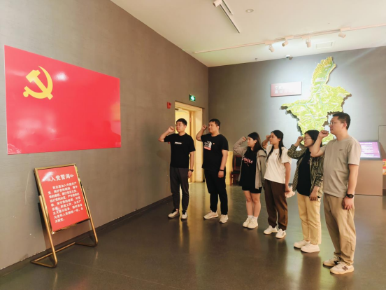 回望來時初心,前行不辱使命。在黨旗前,支部黨員在“紅旗漫卷——寧夏革命文物陳列”專題展覽館開展“重溫入黨誓詞”集中宣誓活動。面對鮮紅的黨旗,黨員們舉起右手,重溫入黨誓詞,一字一句,聲音洪亮,慷慨激昂,表達了對黨的事業奮斗終身的堅定信念與決心。