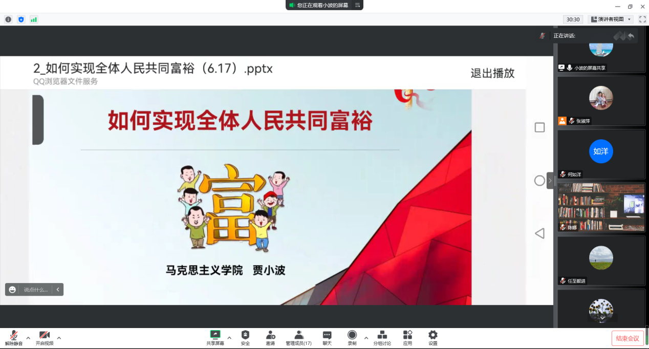 賈小波老師從通過高質(zhì)量發(fā)展、基本公共服務(wù)均等化、優(yōu)化分配制度和政策、促進(jìn)人的全面發(fā)展、勤勞創(chuàng)新五個(gè)方面展開了對(duì)“如何全面實(shí)現(xiàn)共同富?!敝R(shí)點(diǎn)的講授。