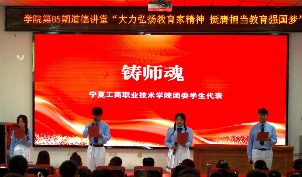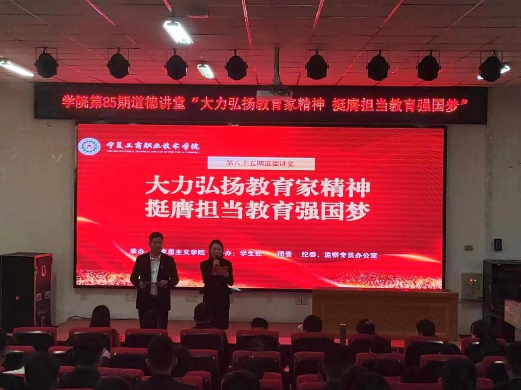 10月9日,由馬克思主義學(xué)院承辦,學(xué)生處、校團(tuán)委、紀(jì)委、監(jiān)察專(zhuān)員辦公室聯(lián)合主辦的寧夏工商職業(yè)技術(shù)學(xué)院第八十五期道德講堂在學(xué)校清風(fēng)園一樓開(kāi)講。馬克思主義學(xué)院全體教師、教師代表以及士官生,近300人參加了活動(dòng)。