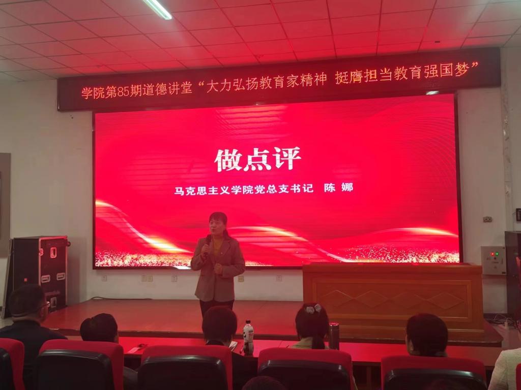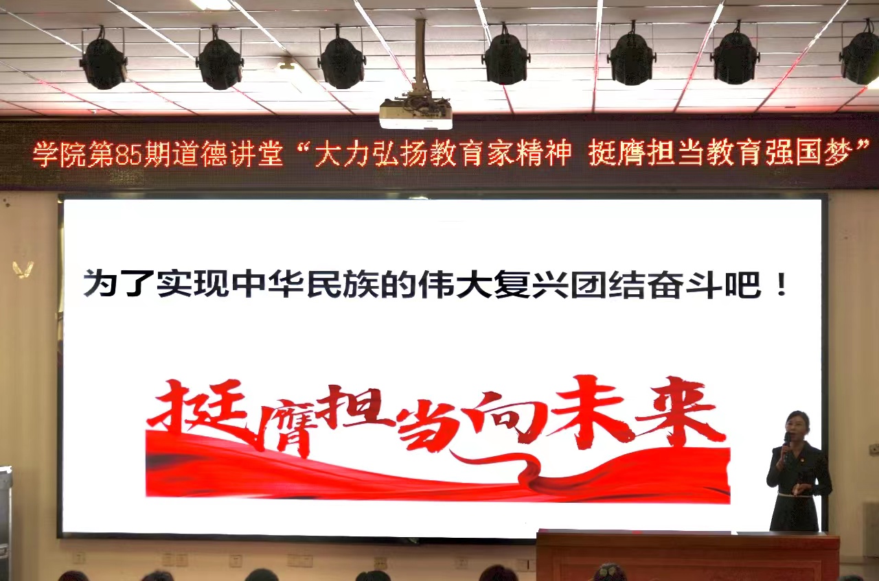 強(qiáng)國(guó)必先強(qiáng)教,強(qiáng)教必先強(qiáng)師。參加道德講堂的全體師生緊緊圍繞“大力弘揚(yáng)教育家精神 挺膺擔(dān)當(dāng)教育強(qiáng)國(guó)夢(mèng)”的主題,通過(guò)觀(guān)視頻、誦經(jīng)典、唱歌曲、講故事、談感悟、送吉祥等多種形式,集中展現(xiàn)了中華民族發(fā)展的歷史長(zhǎng)河里所涌現(xiàn)出的杰出教育者;反映了一代又一代的教育家們躬耕教育、無(wú)私奉獻(xiàn)、以身垂范、桃李滿(mǎn)天下的故事,特別是馬克思主義學(xué)院教授吳曉芹,以孔子為引,通過(guò)講述近代以來(lái)我國(guó)社會(huì)所涌現(xiàn)的大批教育家如張伯苓、陶行知、蔡元培、聞一多、馬景武、張桂梅等為中華民族之崛起和實(shí)現(xiàn)中華民族偉大復(fù)興的中國(guó)夢(mèng)所呈現(xiàn)出的大愛(ài)無(wú)疆、嘔心瀝血、為國(guó)為民、勇于擔(dān)當(dāng)?shù)母腥斯适拢瑤椭鷰熒鷤兩羁汤斫獠?qiáng)烈地體悟到了什么是心有大我、至誠(chéng)報(bào)國(guó)的理想信念;言為士則,行為世范的道德情操;啟智潤(rùn)心,因材施教的育人智慧;勤學(xué)篤行,求是創(chuàng)新的躬耕態(tài)度;樂(lè)教愛(ài)生,甘于奉獻(xiàn)的仁愛(ài)之心以及胸懷天下,以文化人的弘道追求的教育家精神。