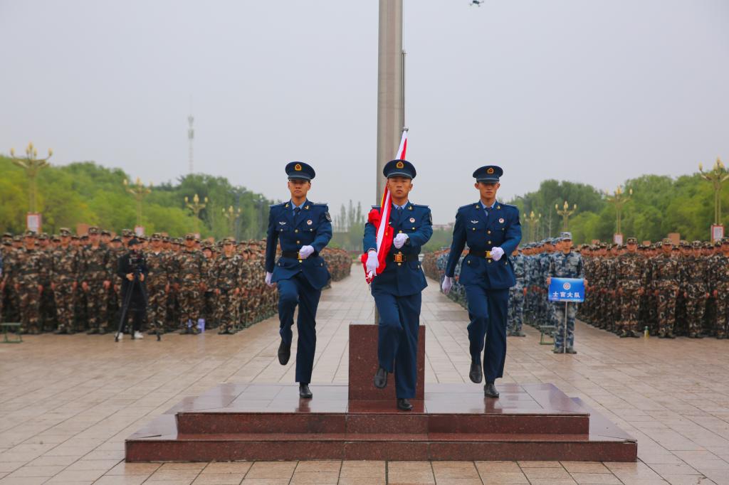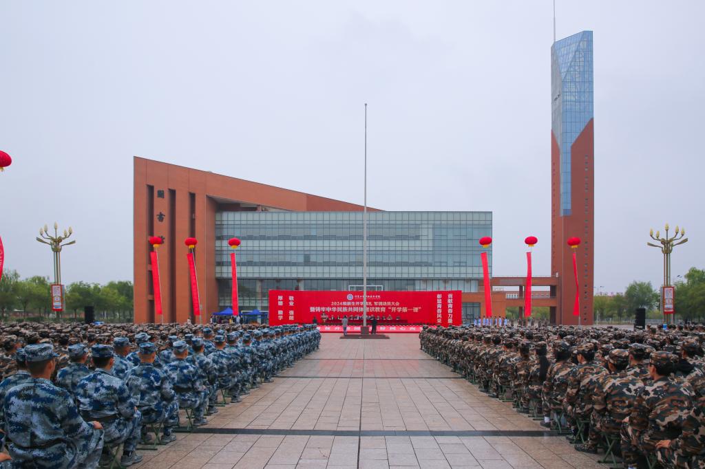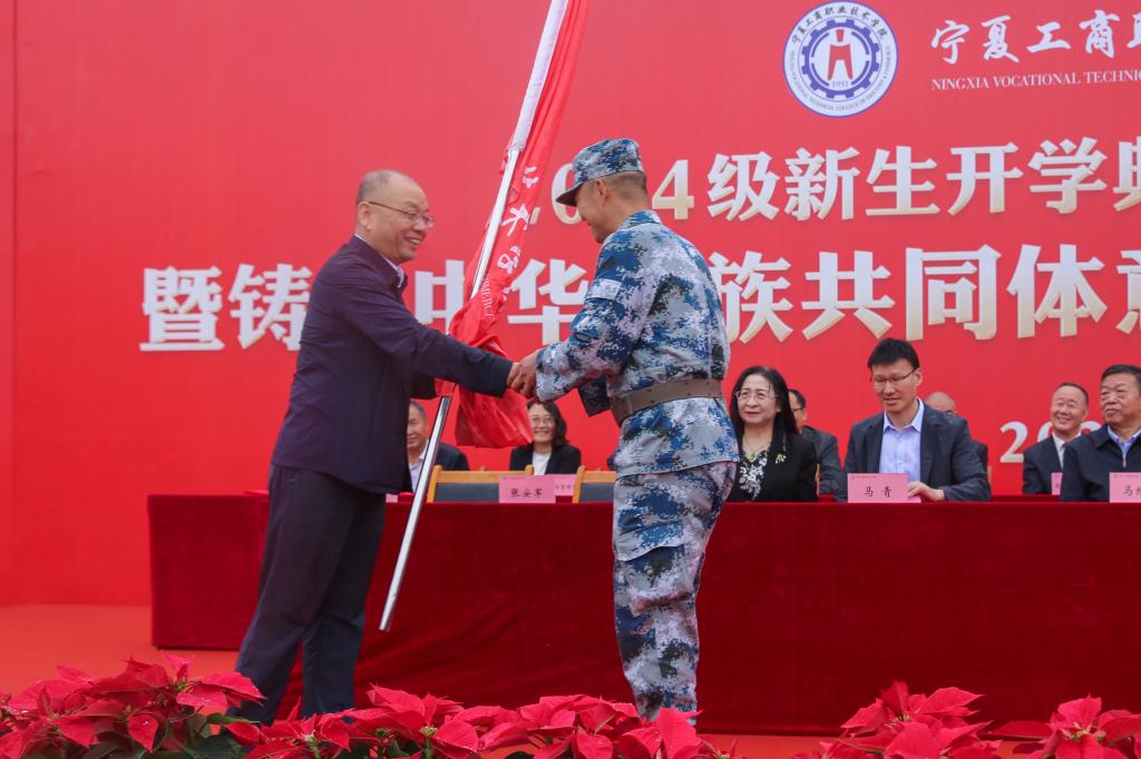 學院黨委書記馬維敏、院長郭少新為新生軍訓團授旗,全場旗幟舞動,歡聲雷動。