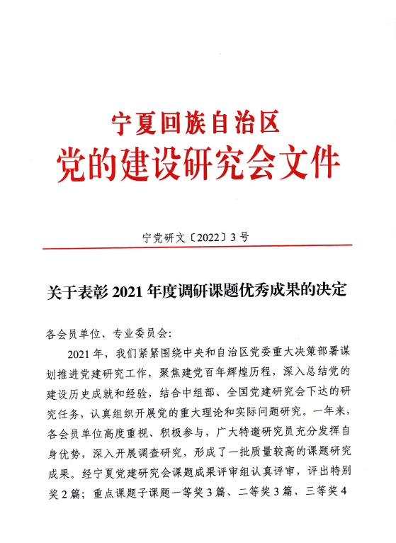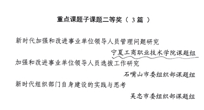 近日,寧夏黨建研究會發(fā)布《關(guān)于表彰2021年度調(diào)研課題優(yōu)秀成果的決定》(寧黨研文〔2022〕3號),寧夏工商職業(yè)技術(shù)學院課題組的研究成果榮獲重點課題子課題二等獎。據(jù)悉,我校是唯一獲得重點課題子課題二等獎以上獎項的高校。